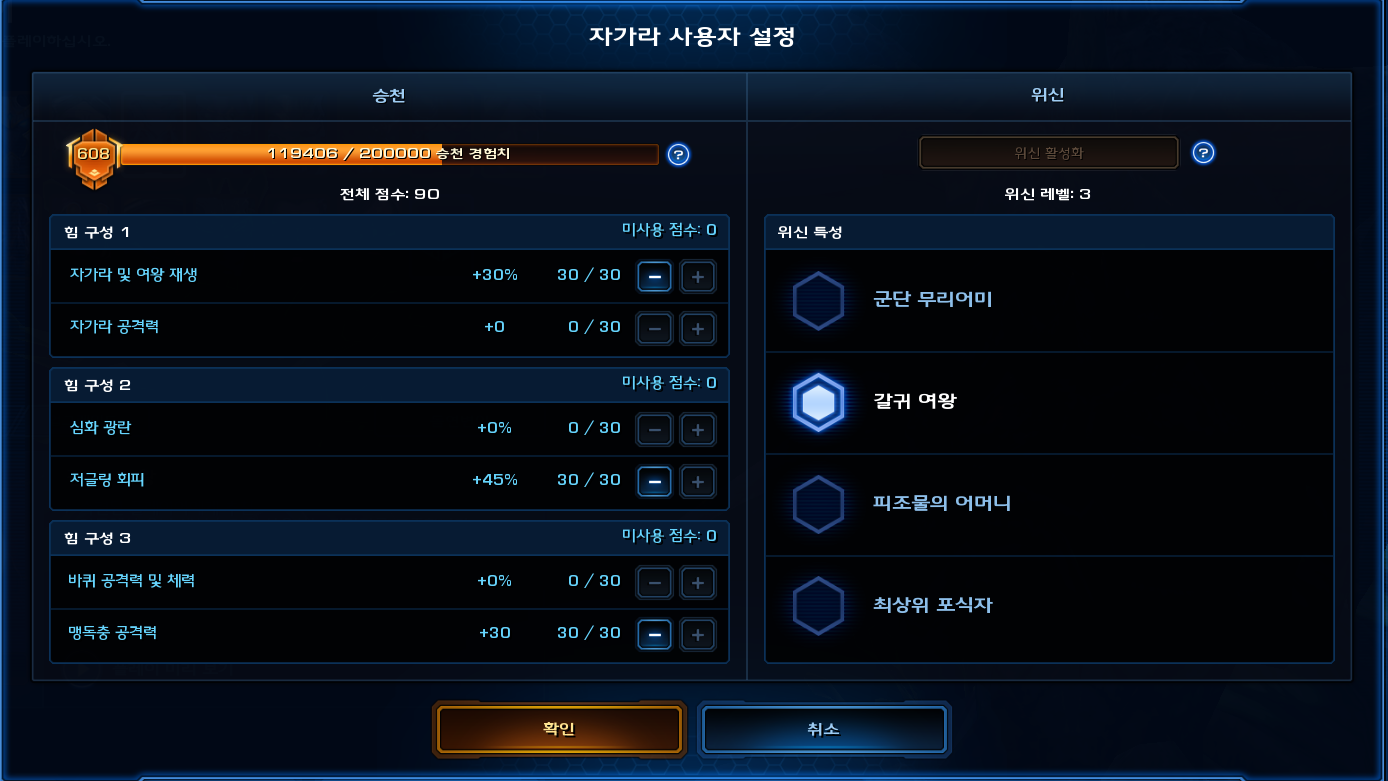 1특성은 1위신에 영향을 주지 않아 아무거나 찍으면 되고, 2특성은 심화광란을 쓸 수 없기에 저글링 회피를 찍어줍니다.